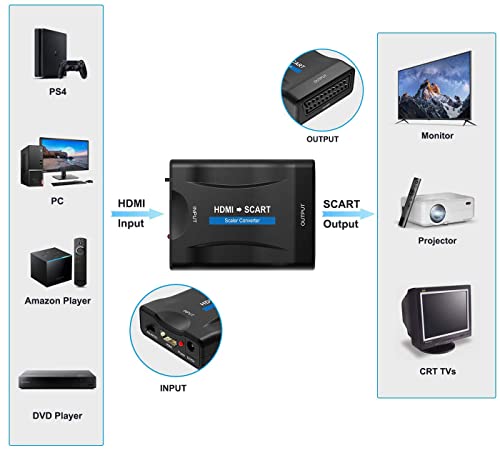 【HDMI a SCART Adattatore】Converte il segnale video e audio HDMI in segnale analogico SCART CVBS, Nota: questo è un convertitore da HDMI a SCART, converte solo il segnale dal dispositivo sorgente HDMI alla tua vecchia TV SCART, NON PU convertire il segnale dal dispositivo sorgente SCART al tuo HDTV HDMI.