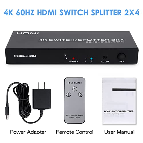 HDMI Splitter Switch 2 in 4 Out, 4K@60Hz Commutatore HDMI Splitter con Telecomando e Uscita Audio SPDIF, per HDTV Blu-Ray PS3 PS4 Xbox Proiettore