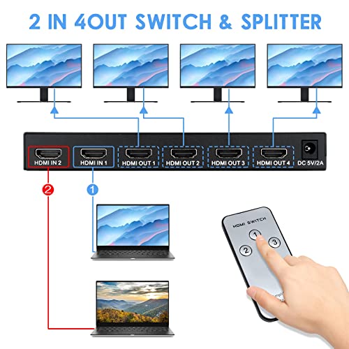 HDMI Siwtch Splitter: Questo Splitter Switch HDMI può trasmettere facilmente audio e video da 2 dispositivi HDMI a 4 display HDMI contemporaneamente. 【*NOTA*: 4 display mostreranno la stessa immagine, non supportano la visualizzazione di schermi diversi】