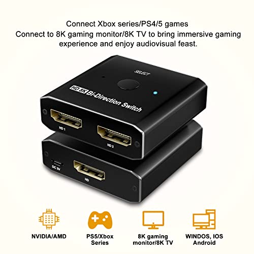HDMI 2.1 Switch 8K@60Hz Bi-direzione, HDMI Splitter 2 IN 1 OUT o 1 IN 2 OUT, EDID adattivo, Interruttore HDMI 2.1 4K@120Hz per PS5 PS4 PS3 Xbox HD TV, Interruttore a Pulsante, Plug and Play