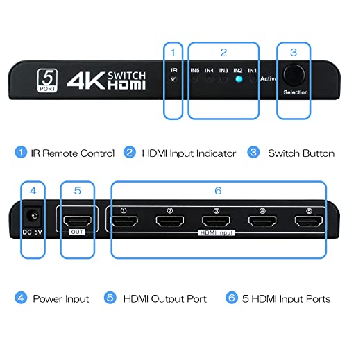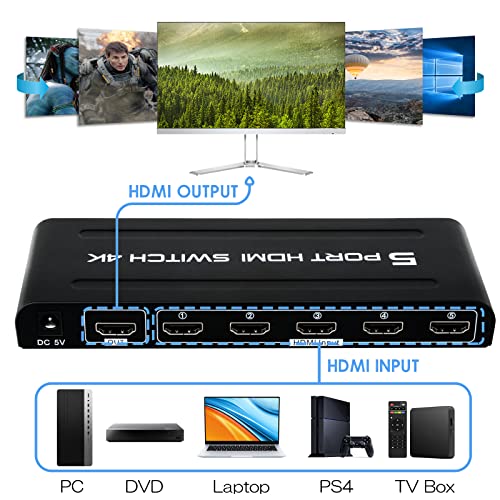 Switch HDMI 5 Porte - Questo 5x1 HDMI Switch consente di collegare fino a 5 sorgenti HDMI a 1 monitor/proiettore HDTV/HD e passare facilmente tra 5 sorgenti. Adatto a casa, ufficio, riunioni e altri scenari.