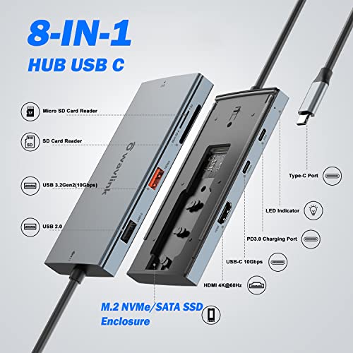 Hub USB C HDMI, WAVLINK Case SSD M.2 NVME/SATA, 8-IN-1 Docking Station USB C, con 4K HDMI 60Hz, USB-A/C 3.2 Gen 2 10Gbps, PD 100W, per Windows Mac.