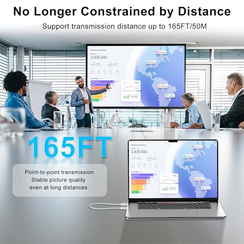 [Bassa Latenza Trasmissione] La tecnologia standard di trasmissione a 5GHz integrata nel trasmettitore hdmi wireless rende l'efficienza della trasmissione più veloce e più stabile, con una latenza di soli 0,08s (quasi in tempo reale). Ha una potente trasmissione del segnale a lunga distanza che può penetrare pareti, pavimenti e soffitti, fino a una distanza di mirroring di 165FT/50M. (I vetri delle pareti e altri ostacoli simili possono ridurre la portata e la stabilità della trasmissione)