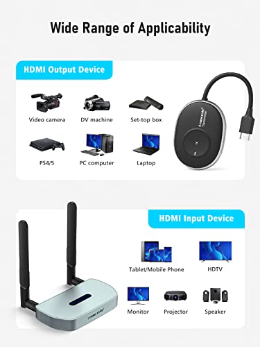 【Distanza di trasmissione wireless fino a 50 m】 La trasmissione wireless HDMI è dotata di tecnologia dual-band da 2,4 GHz/5 GHz, che trasmette video e audio in un ambiente privo di barriere da laptop/PC/fotocamera a HDTV, proiettore, monitor fino a 50 m senza interruzione può trasmettere. Si prega di notare che il raggio di trasmissione si riduce a 32 piedi/10 m se utilizzato su pareti o pavimenti.