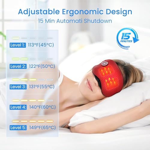 Maschera per occhi riscaldata a 5 livelli: questa maschera per gli occhi riscaldata senza fili ha 5 livelli di temperatura regolabile, 149/140/131/122/113℉ (65/60/55/50/45 ℃) per soddisfare le esigenze di temperatura appropriate per diverse sensazioni del corpo. Il riscaldamento si fermerà automaticamente dopo 15 minuti per garantire sicurezza ed efficacia. Puoi scegliere la temperatura e il tempo ideali in base alle tue esigenze. Utilizzare maschere riscaldate per fornire calore continuo per un sollievo asciutto degli occhi, più comodo delle maschere per gli occhi a vapore.