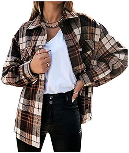HEAVY Donna Casual Vintage Manica Lunga Plaid Camicia Cappotto Tasca con Risvolto Misto Lana Shacket Giacca Cappotto per Primavera Autunno Inverno-Marrone_L.