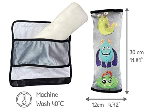 HECKBO Cuscino per Auto per Bambini con Mostri - Lavabile in Lavatrice - 30x12cm - Morbido Cuscino di Alta Qualità - Cuscino per Cintura di Sicurezza, Cuscino da Viaggio, Protezione Copricintura