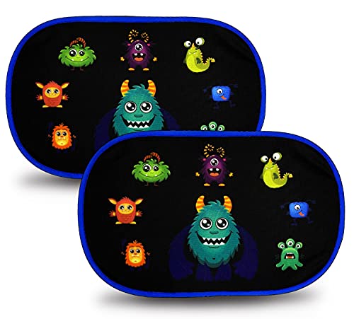 2x HECKBO Parasole Autoadesivo per Auto - Protezione dal Sole per Bambini - mostro - 48x31cm - Tendine Autoadesive per Finestrini e Lunotto con Custodia