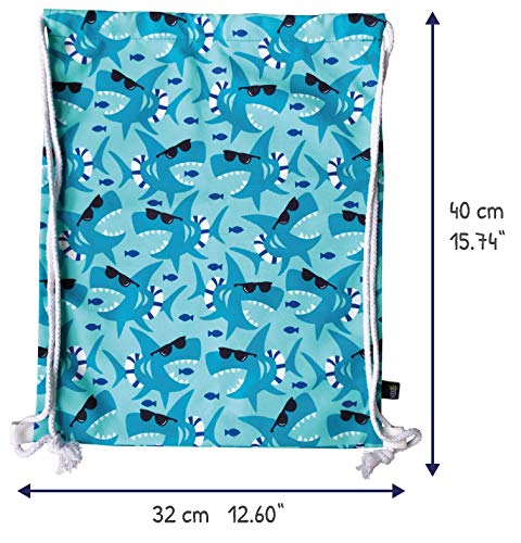HECKBO Sacca per Bambini Squali con Occhiali da Sole - Adatto a Bambini e Bambine - Lavabile in Lavatrice - 40x32cm - Ideale per Asilo, Scuola Materna, Viaggi, Sport, Scuola