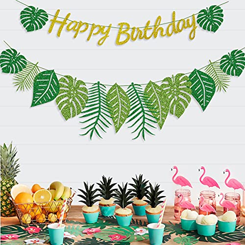 BANNER DI DECORAZIONE DEL PARTITO HAWAIIANO - Include striscione di buon compleanno con glitter dorati che viene fornito con 2 foglie di palma e striscioni per feste in foglia di palma con glitter verde. Splendide decorazioni che hanno reso perfetta questa festa di compleanno estiva.