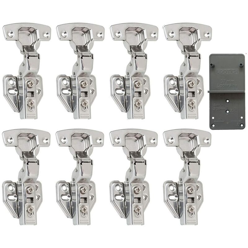 Con dima di foratura per tutte le cerniere a scomparsa standard da 26 mm e 35 mm Cerniere a chiusura ammortizzata - ammortizzatore automatico e integrato Chiusura ammortizzata automatica e quasi completa della porta dopo il ritiro della molla Queste cerniere silenziose sono adatte per la costruzione di armadi o la sostituzione di vecchie cerniere;