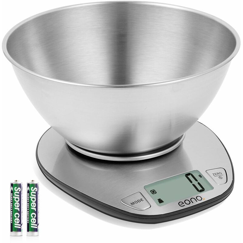 schermo LCD retroilluminato per una lettura ottimale delle misurazioni. Questa bilancia da cucina digitale può misurare il peso degli ingredienti secchi e indicare il volume dei liquidi (acqua e latte). Grande ciotola in acciaio inossidabile rimovibile, con un diametro di 21 cm e un'altezza di 10 cm, e facile da pulire.