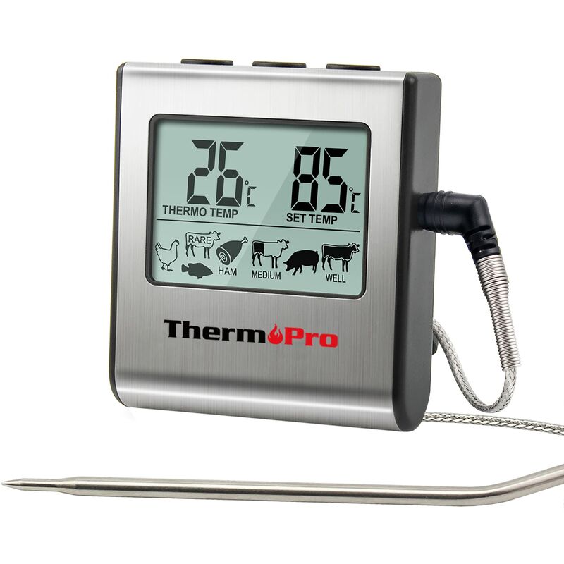 Funzionamento semplice: termometro per carne accurato con sonda in acciaio inossidabile per uso alimentare da 6,5 con punta STEP-DOWN per ottenere la temperatura in modo rapido e preciso. Un cavo a rete in acciaio inossidabile da 1 metro collega il termometro alla base, fuori dal forno Come cucinare: il termometro per barbecue ThermoPro Grill è ideale per il forno, l'affumicatore e il piano cottura. Avvisi programmabili con temperature preimpostate basate sugli alimenti come raccomandato dall'USDA. È anche possibile impostare la temperatura manualmente Timer: il timer da cucina digitale include un cronometro e un timer fino a 99 ore e 59 minuti Intervallo di temperatura: possibilità di visualizzare le temperature in Fahrenheit e Celsius. Intervallo: da 0 a 300 gradi Celsius;