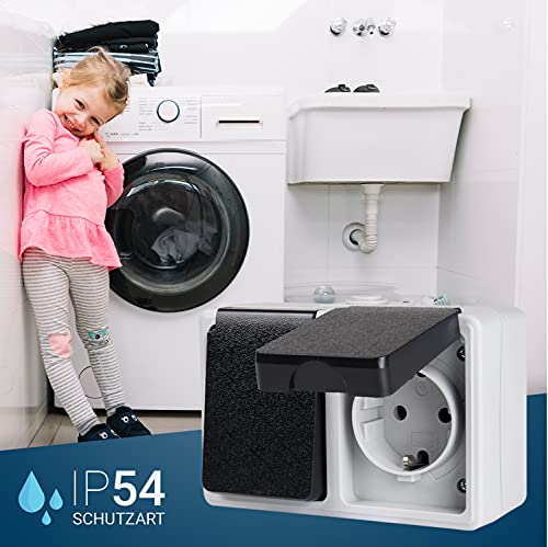 HEITECH Presa di corrente esterna per ambienti umidi IP44 - Nuovo modello - Presa di corrente esterna a 2 ganci AP con coperchio incernierato 250V 16A 2 poli