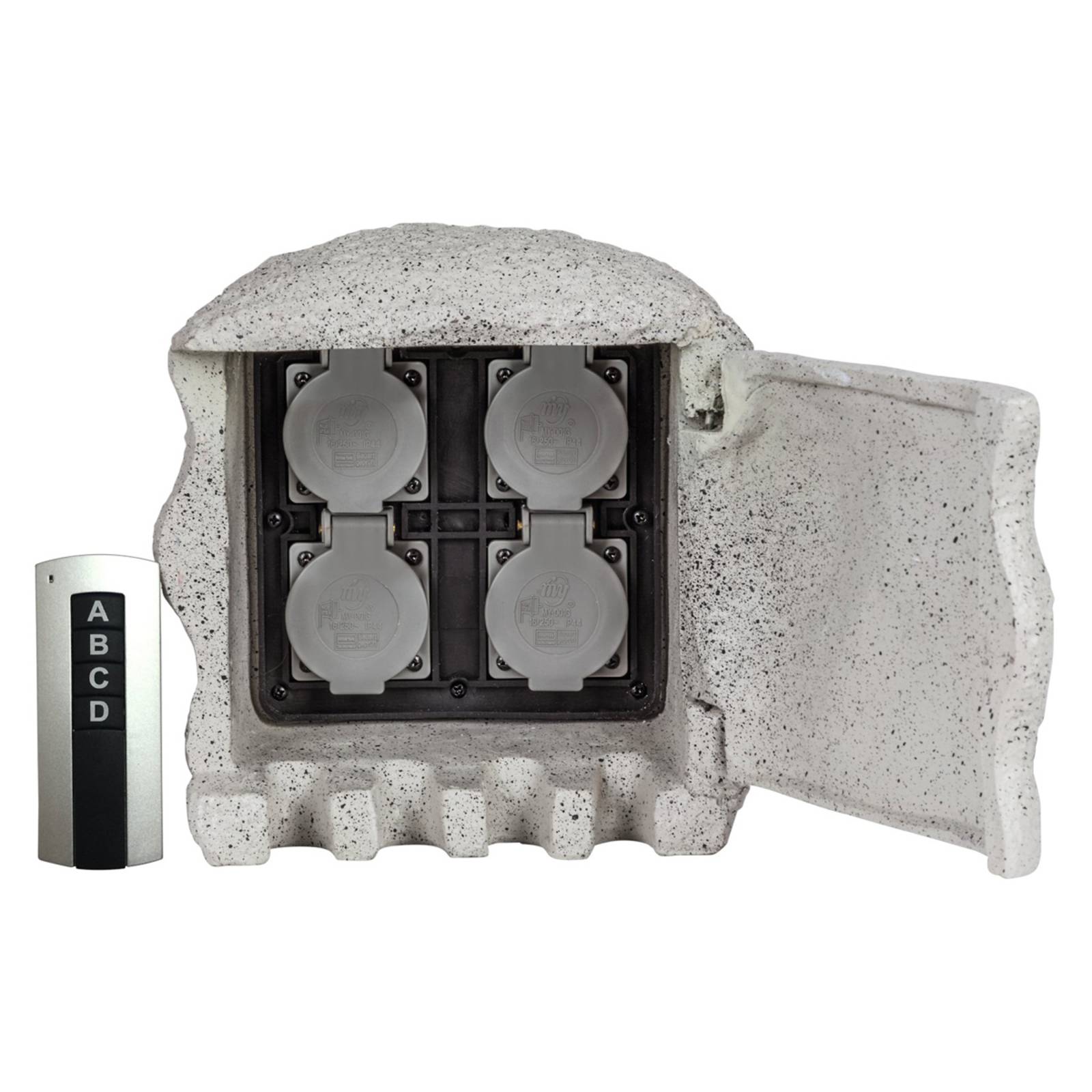 Allacciamento elettrico Piedra in finto granito con telecomando Molto decorativo e pratico questo allacciamento elettrico Piedra in poliresina a forma di pietra in granito. Permette di collegare quattro luci o attrezzi con un carico massimo fino a 1.200 W. È dotato di cavo di allacciamento da 5 m H07RN-F3G1,5. Con il telecomando radio compreso nella fornitura con un raggio di azione fino a 30 m è possibile accendere o spegnere singolarmente le 4 prese. grado di protezione IP44.