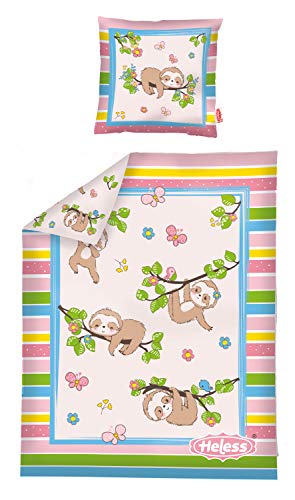 Il set di biancheria da letto colorato con motivo "Faultier Flauschi" è composto da una coperta reversibile e un cuscino abbinato, decorati con allegri bradipi, fiori e farfalle
