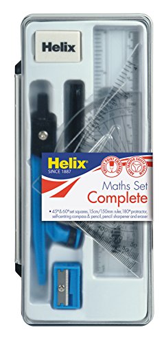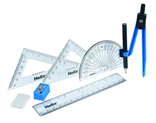 Contiene Self centring compass, temperamatite, gomma, righello da 15 cm, 45/60 Degree Set Squares, 180 gradi goniometro e una matita 9 cm