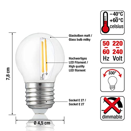 Hellum Lampadine di filamenti a LED base E27, 10 pezzi, 4,5W lampadina filamento LED sfera goccia, bianco caldo 2700K vintage lampada led, opaco 209211