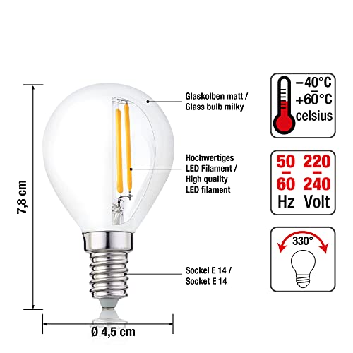Hellum Lampadine di filamenti a LED base E14, 3 pezzi, 4W lampadina filamento LED sfera goccia, bianco caldo 2700 K vintage lampada led G45, opaco 208214