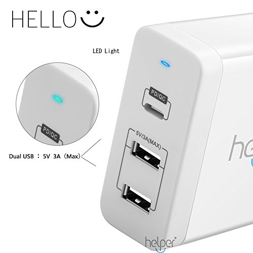 Helper Caricatore da Parete da 60W con 3 Porte USB Type-C PD QC, Dotato di USB-C Power Delivery, per MacBook pro, Nintendo Switch,Swift 7,Zenbook,Yoga 910,iPhone X 8 Plus, iPad, ed altri