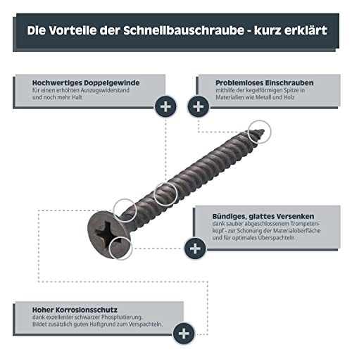 Fosfatizzato: la fosfatazione nera delle viti offre protezione contro la corrosione in caso di sollecitazioni brevi come durante la costruzione o il trasporto. Inoltre è ideale per l'adesione di stucco.