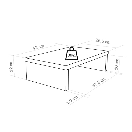 Struttura stabile e resistente, è realizzato in Melaminico di spessore 19Mm per ottenere una grande resistenza. Dotato di 4 cuscinetti antiscivolo sul fondo per evitare scivolamenti e graffi sulla scrivania o sui mobili e ottenere stabilità . Lo spazio interno libero è 37,5 cm (larghezza) x 26,5 cm (profondità) x 10 cm (altezza). Capacità di carico 50 Kg.