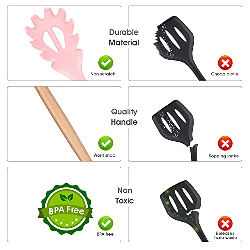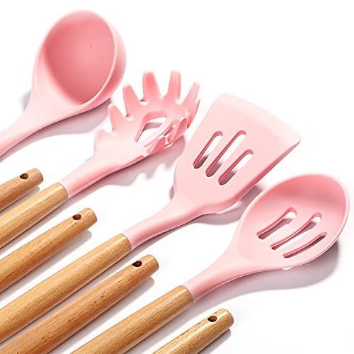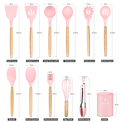 HENSHOW Set Utensili da Cucina, 12 Pezzi in Silicone Include Porta Utensili - Antiaderente AntiGraffio con Manico in Legno (Colore Rosa)