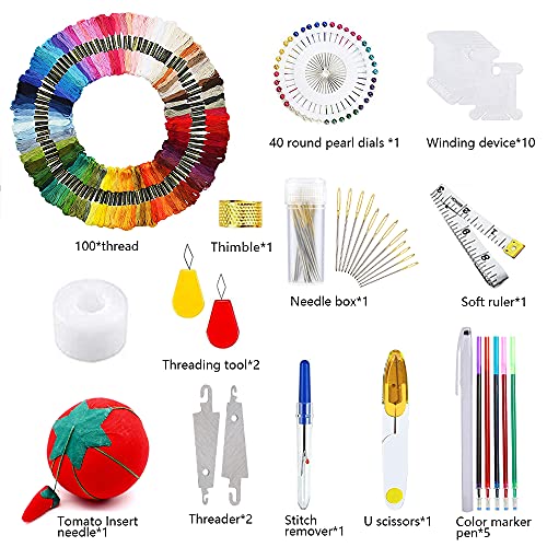 【Eccellente Rapporto Qualità-prezzo】 Il nostro kit di base per ricamo è dotato di tutti gli strumenti: 5 anelli da ricamo in bambù, fili da ricamo in 100 colori, 3 tessuti ricamati, 10 tagli avvolgimento, 1 forbice, 5 penne solubili in acqua, 1 portapenne, 1 perno inserimento, 1 metro a nastro, 1 quadrante, 1 cera per linea di produzione, 30 aghi per ricamo, 4 utensili per infilare a punto croce, 1 ditale, 1 attrezzo disteso.