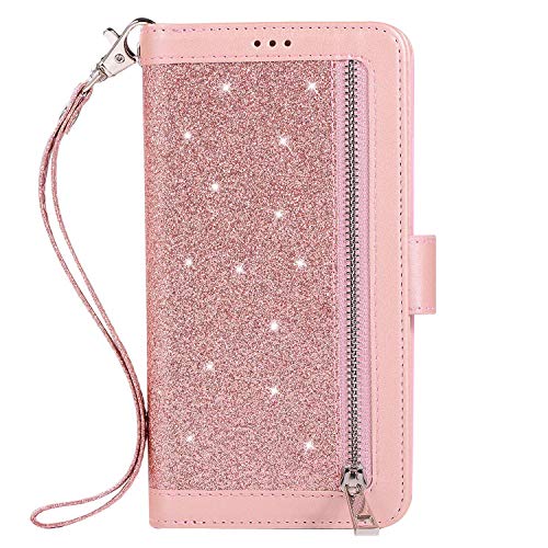 Herbests Cover PU Pelle Custodia Portafoglio Copertura Brillantini Glitter Wallet Cover Slots Multi-Card (Nove Slots) Multifunzione Flip Custodia compatibile con Samsung Galaxy J4 Plus,Oro Rosa