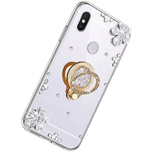 Herbests Cover Specchio per Xiaomi Redmi S2 Sottile Custodia Silicone Glitter Bling Diamante Brillante con Anello Supporto Cover TPU Silicone Protettiva Morbido Case, Argento