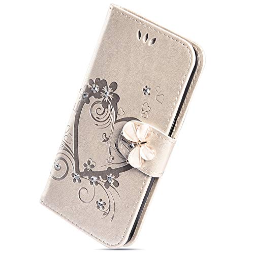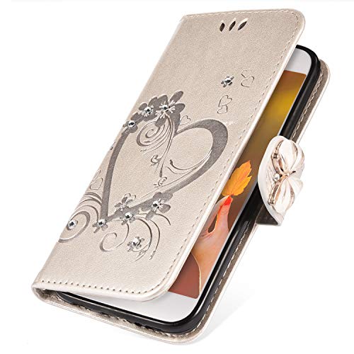 Herbests Custodia Compatibile con Huawei Mate 20 Lite Case Cover PU Pelle Custodia Portafoglio Elegante Cuore Amore Fiori Diamante Strass Flip Wallet Case con Supporto, Oro