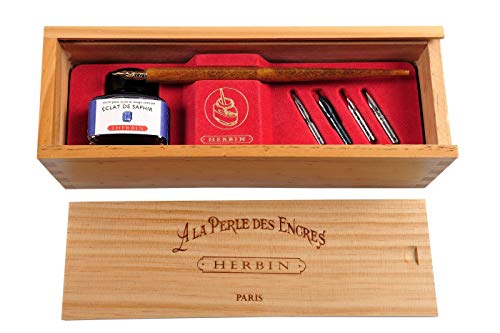 Herbin 27016T - Confezione in legno Zaffiro include un portapenna in legno, 5 pennini in metallo, un flacone di inchiostro 30 ml e istruzioni d'uso