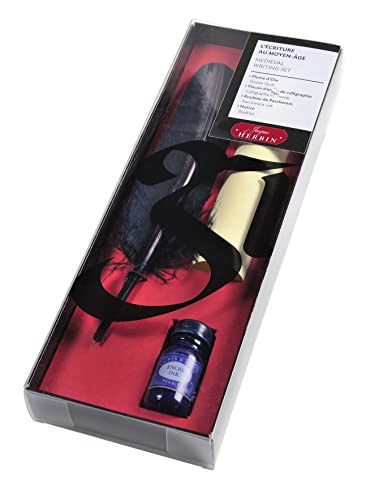 Herbin 28210T - Kit Scrittura Medioevo include una piuma d'oca Blu, un foglio di pergamena, un flacone di inchiostro blu e istruzioni