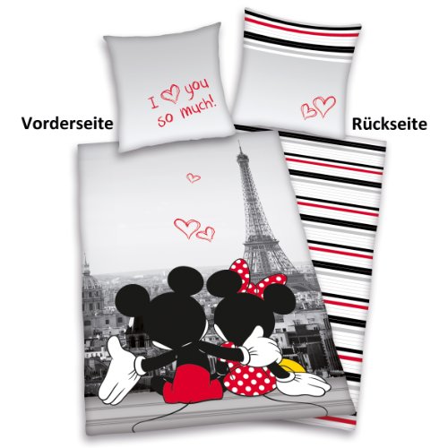 Herding, Biancheria da letto, Motivo: Topolino e Minnie a Parigi, Federa 80 x 80 cm e Copripiumino 135 x 200 cm, Multicolore