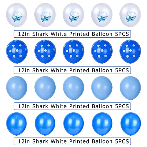 Kit di Palloncini a Tema Marino - Le decorazioni per la festa di compleanno dei bambini da 40 pezzi contengono 1 squalo palloncino spaziale, 1 palloncino numerico, 2 palloncini foil con stella a cinque punte, 9 palloncini a pois, 4 palloncini occhio di polpo, 8 palloncini lunghi, 5 palloncini stampati con squali, 10 palloncino in lattice blu, 2 nastri per palloncini.