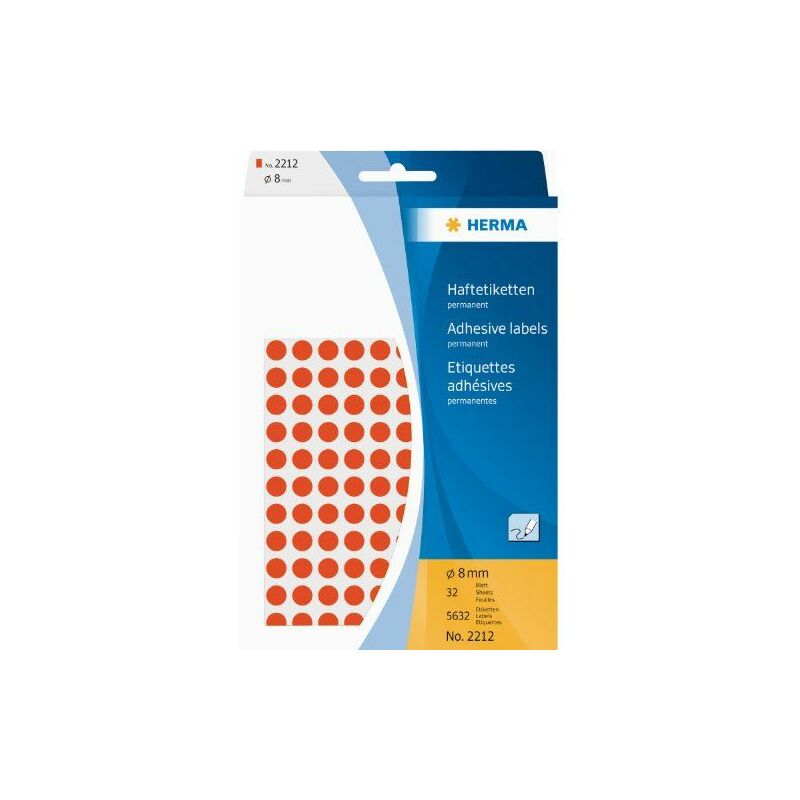 HERMA 2212. Colore del prodotto: Rosso, Forma: Cerchio, Materiali: Cellulosa, Carta. Larghezza: 8 mm, Altezza: 8 mm, Diametro: 8 mm. Etichette da pacchi: 5632 pezzo(i), Fogli per pacco: 32 fogli