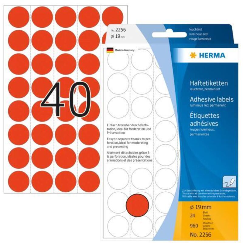 HERMA 2256. Colore del prodotto: Rosso, Forma: Cerchio, Materiali: Cellulosa, Carta. Larghezza: 19 mm, Altezza: 19 mm, Diametro: 1,9 cm. Etichette da pacchi: 960 pezzo(i), Fogli per pacco: 24 fogli