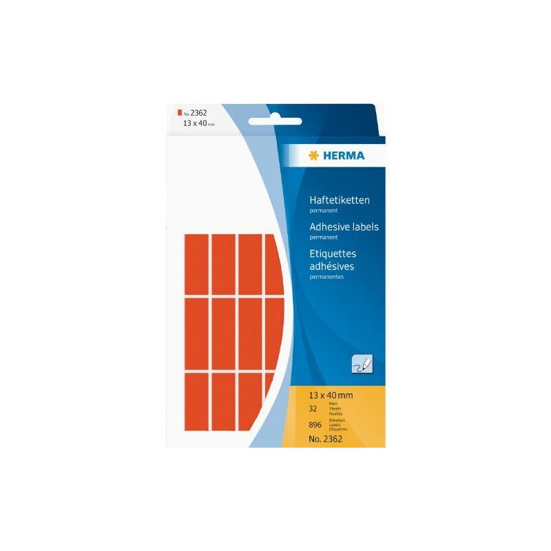 HERMA 2362. Colore del prodotto: Rosso, Forma: Rettangolo con angoli arrotondati, Materiali: Cellulosa, Carta. Larghezza: 13 mm, Altezza: 40 mm, Larghezza del foglio: 11,1 cm. Etichette da pacchi: 896 pezzo(i), Fogli per pacco: 32 fogli