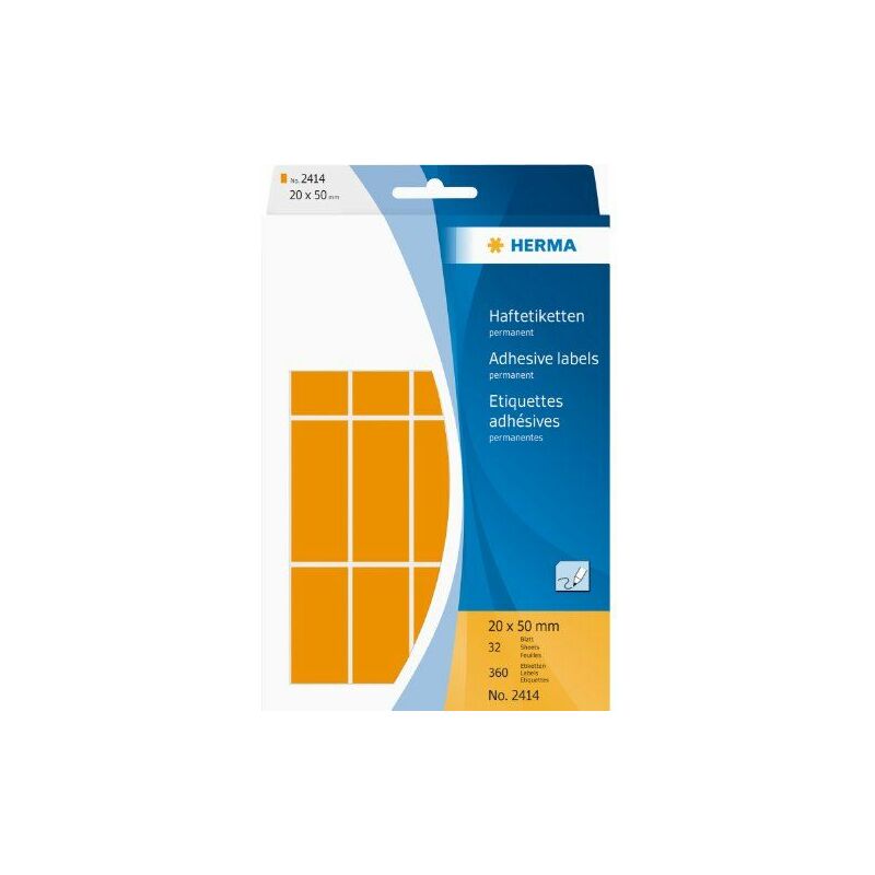 HERMA 2414. Colore del prodotto: Arancione, Forma: Rettangolo con angoli arrotondati, Materiali: Cellulosa, Carta. Larghezza: 20 mm, Altezza: 50 mm, Larghezza del foglio: 11,1 cm. Etichette da pacchi: 360 pezzo(i), Fogli per pacco: 24 fogli