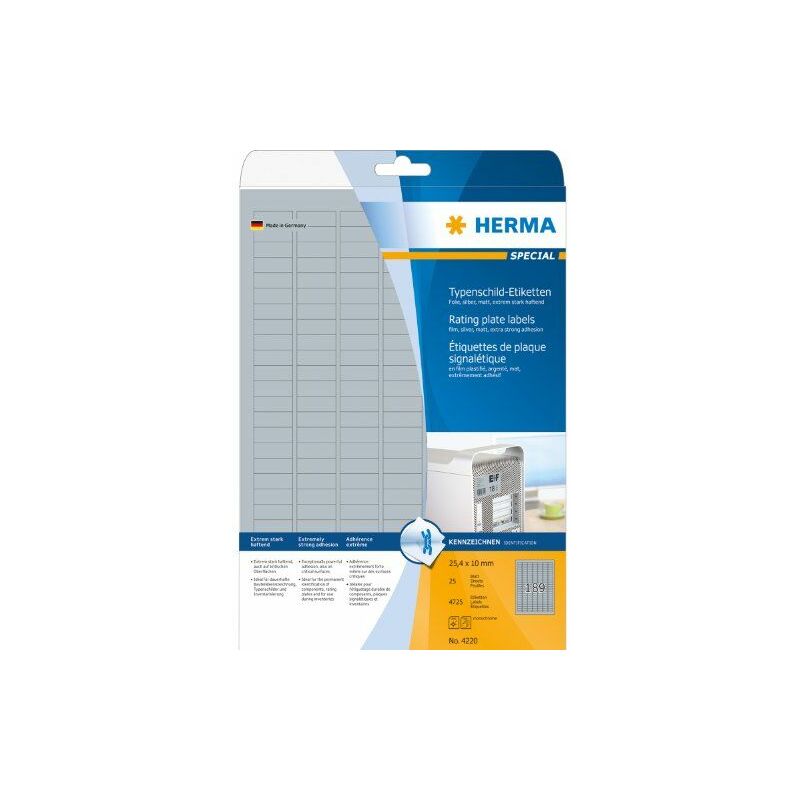 HERMA 4220. Colore del prodotto: Argento, Forma: Rettangolo con angoli arrotondati, Tipo di adesivo: Permanente. Larghezza: 25 mm, Altezza: 10 mm. Etichette da pacchi: 4725 pezzo(i), Etichette per foglio: 189 pezzo(i), Fogli per pacco: 25 fogli