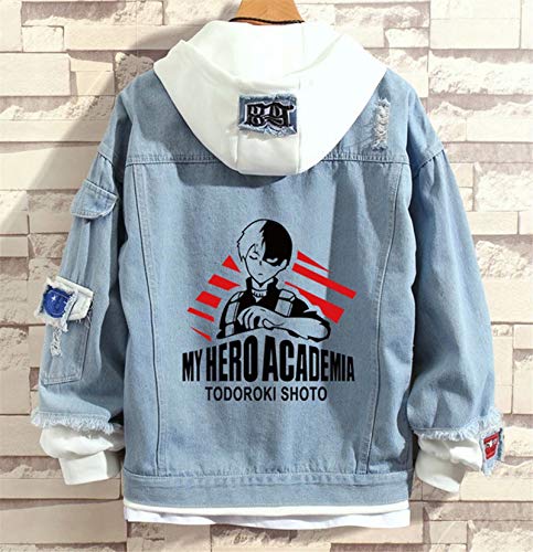 Caratteristica: Denim lavato Retro Broken Hole, classico finto design a due pezzi, con cappuccio e coulisse, stile anime cuciture personalità, My Hero Academia Anime Denim Jacket Hoodie, adatto per coppia, ragazzi, ragazzi e ragazze, taglie S-3XL disponibili