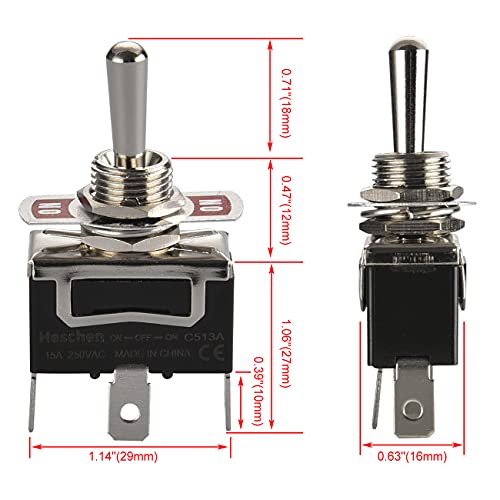 Heschen Interruttore a levetta in metallo, C513A, SPDT, Mantenuto (a scatto) ON/OFF/ON, 3 Posizione, 15A 250VAC, 3 Tab Terminal, CE, con cappuccio impermeabile