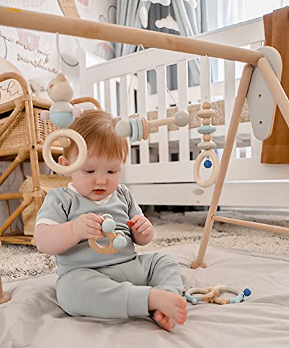 Giocattolo a forma di stella con catena a palline mobili nei colori nero, bianco, grigio e legno, dalla forma ergonomica, dimensioni circa 8,5 x 5 x 11 cm