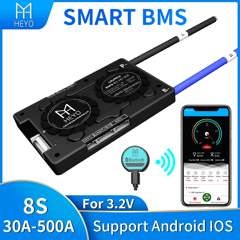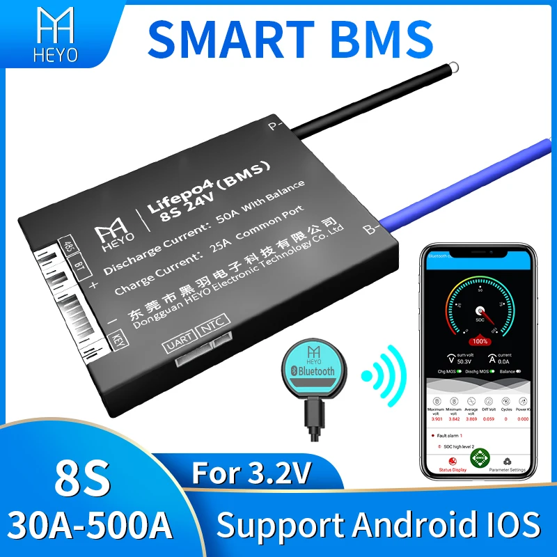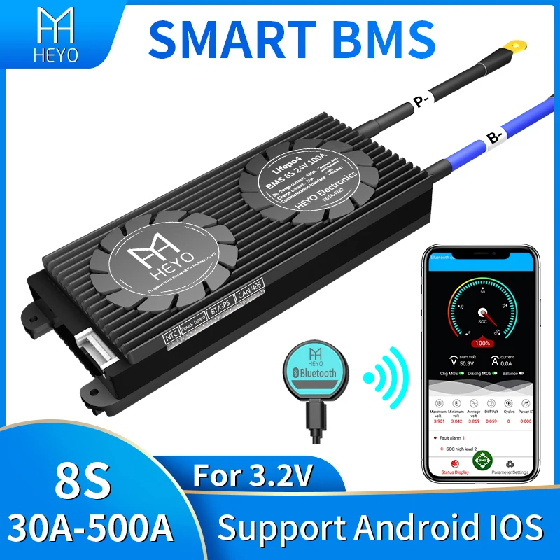 HEYO Bluetooth GPS UART RS485 CANbus NTC Battery pack Smart LiFePO4 Lipo cell 8S 24V 30A 60A 80A 100A 200A 250A 300A 500A BMS