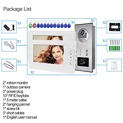 HFeng 7 '' Color Wired Video Citofono Citofono Kit 700TVL RFID Telecamera per ingresso di accesso Campanello IR Visione notturna per multi-appartamenti/famiglia/casa 100 metri (1 camera 2 monitors)