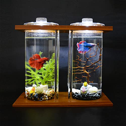 HGFTJY Piccolo acquario Betta,Serbatoio di pesce cilindro,Serbatoio di pesce in vetro trasparente,Mini acquario ecologico con sabbia inferiore e luce di copertura