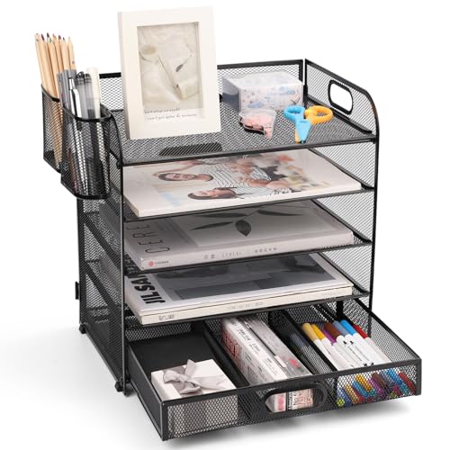 Hggzeg Organizer in rete per lettere, organizer da scrivania per ufficio, portadocumenti, formato A4, per casa, ufficio, scuola (rete metallica, 5 ripiani, cassetto e portapenne)