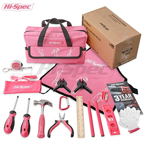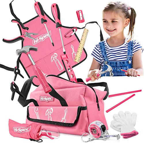 Hi-Spec Kit di Attrezzi per Bambini da 18 Pezzi con Borsa degli Attrezzi Rosa, Occhiali di Sicurezza, Attrezzi Veri di Dimensione Ridotta, Martello per Il Set di per Bambini