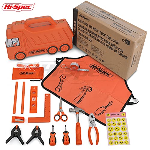 Hi-Spec Kit di Attrezzi da 17 Pezzi Bambini con Cassetta degli Attrezzi Arancione a Forma di Camion, Grembiulino con Tasche, Occhiali di Sicurezza, Livella