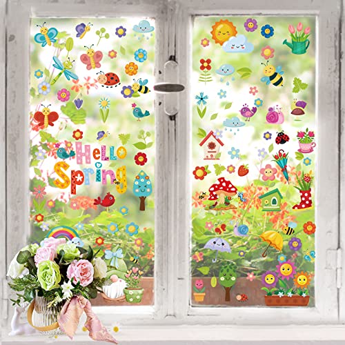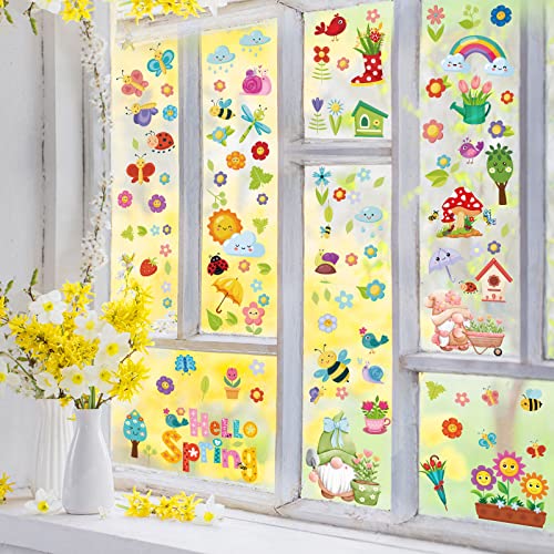 Set di 9 Fogli Grandi Il pacchetto include 9 fogli grandi di adesivi per finestre Happy Spring, include molti modelli di elementi primaverili, come rose, fiori, erba, sole, nuvole, arcobaleno, ombrello, ecc.